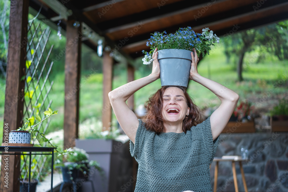 Young happy funny Caucasian woman holding pot of flowers above her head while sitting on wooden terrace of country cottage, summer lifestyle portrait