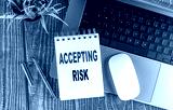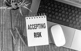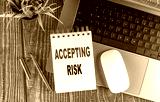 ACCEPTING RISK text on notebook with laptop, mouse and pen