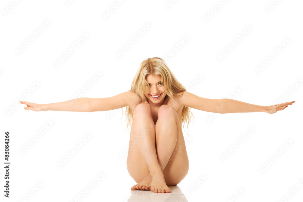Nude woman sitting, spreding her arms