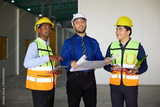 workers or engineers planning from work on blueprint drawing paper in the factory