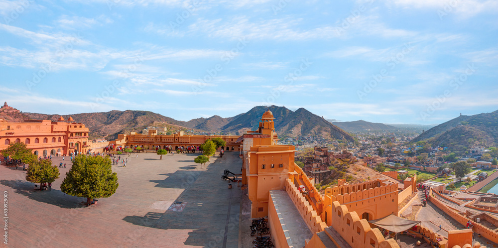 Tourists enjoy an elephant ride at Amer Fort Jaipur Rajasthan. Elephant rides are popular tourist attraction in Amber Fort with full moon - Jaipur, India
