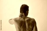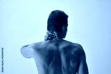 Rear view of shirtless man holding his neck, suffering from spine, neck pains isolated on grey studio background. Concept of male beauty, body care, fitness, sport, health, medical care