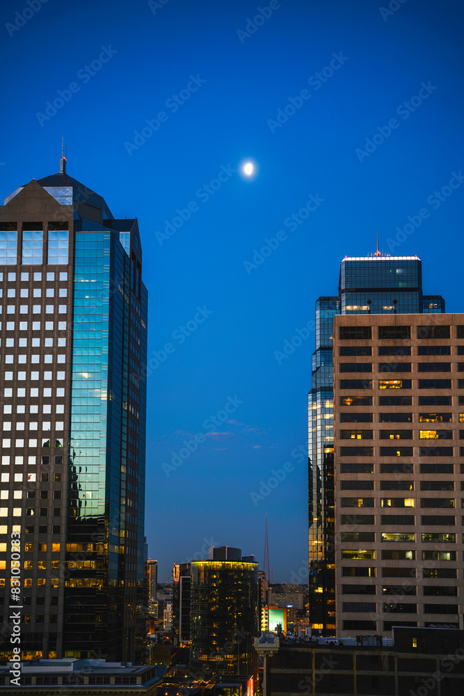 Kansas City Missouri Skyline and Skyscrapers at Twilight: The modern metropolis cityscape with half-moon in the clear blue sky