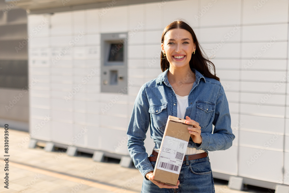 Happy lady holding mailbox in her hands, standing near automatic post terminal and smiling at camera, free space. Concept of smart delivery, modern shipping and logistics