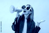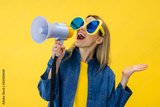 Funny young woman girl isolated on yellow studio background Screaming in megaphone wearing funny huge sunglasses