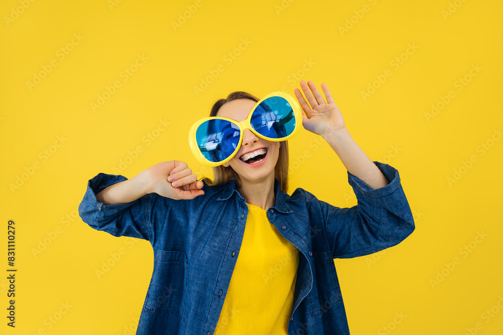 Young female wearing large big glasses and dancing while enjoying music over yellow studio background. Energetic woman in stylish clothes having great time while celebrating birthday.