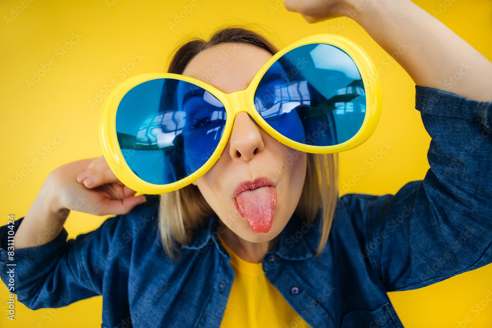 Closeup wide shot fisheye portrait of young beautiful hipster woman in sunglasses showing her tongue