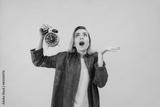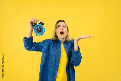 Amusing pretty young woman holding alarm clock and shouting over yellow background. Late for work or lessons