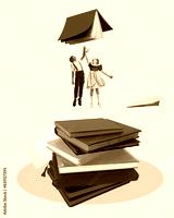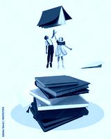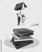 Boy and girl flying with umbrella above pile of books against light background. Path to knowledges. Contemporary art collage. Concept of childhood, education. Creative design in pastel colors
