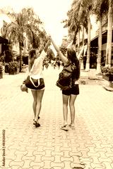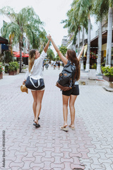 portrait of latin couple of women tourist backpackers in Mexico Latin America, hispanic female people in caribbean city or tropical beach at vacations