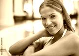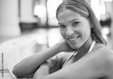 Portrait, hotel and woman at swimming pool with peace, relax and holiday on summer weekend with smile. Calm, water and girl at luxury spa resort for vacation with hospitality, health and wellness
