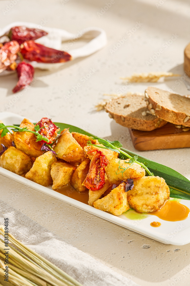 Delicious Eggplant in Sweet Chili Sauce - Contemporary Plated Vegan Dish with Fresh Ingredients