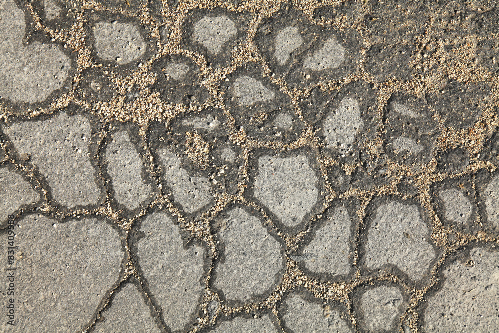 Textured backdrop. Web of cracks. Mosaic texture, background of an old, cracked road. An old asphalt surface, background. Detailed texture of the bitumen close-up. Screen short. Road foundation