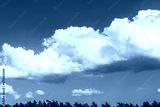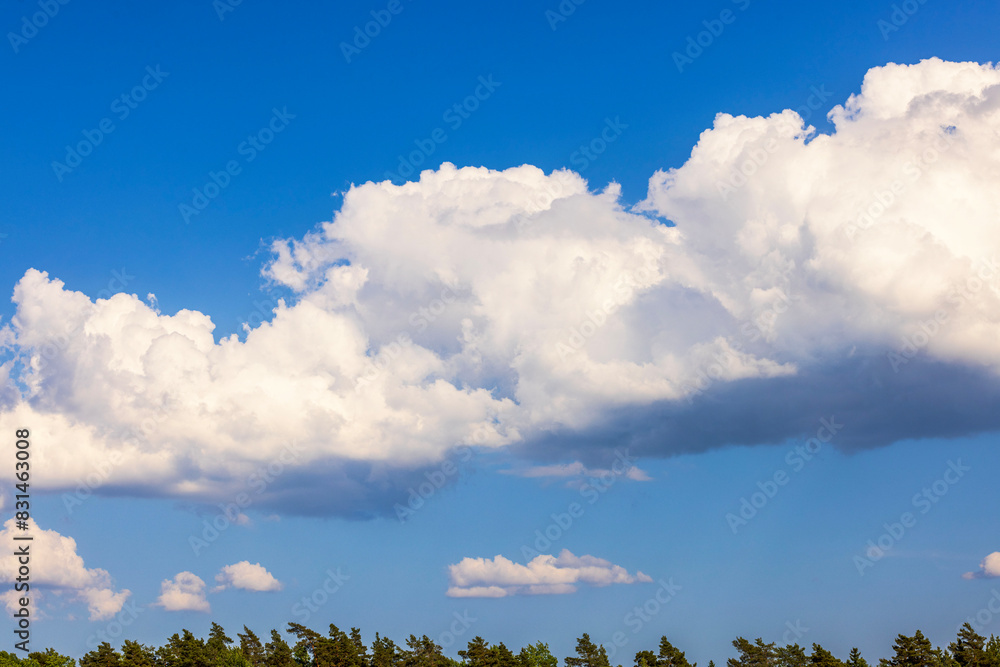 Beautiful view of the blue sky with white clouds above the tops of pine forest trees. Sweden.