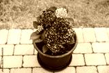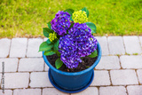 Close-up view of beautiful purple hydrangea flowers in a garden pot on the villa's sidewalk. Sweden.