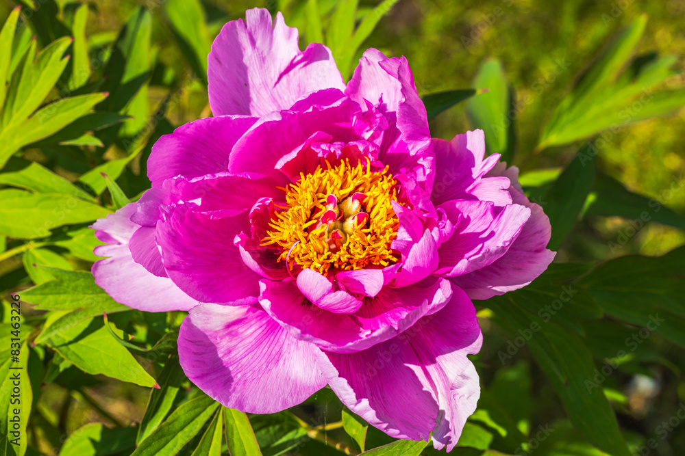 Close-up of a pink peony flower in full bloom on a bright spring day.