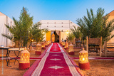 Luxury tent camp illuminated with fire lamps at Erg Chebbi Sahara desert at evening near Merzouga town, Morocco, North Africa