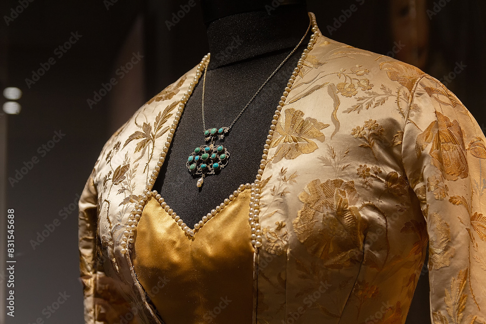 Luxurious retro dress and brooch on a mannequin. Fashion