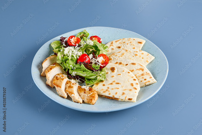 Healthy Caesar Salad with Chicken and Tortilla on Blue Background