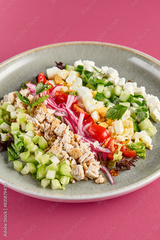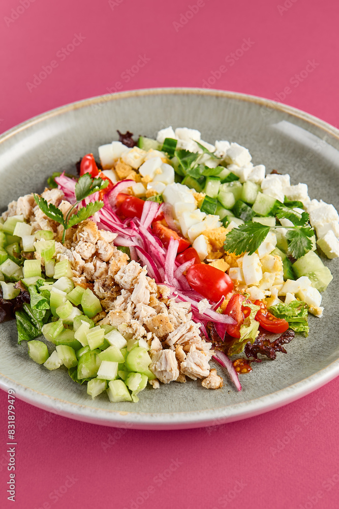 Fresh Cobb Salad with Mixed Greens, Chicken, Tomato, and Crumbled Cheese on Pink Background