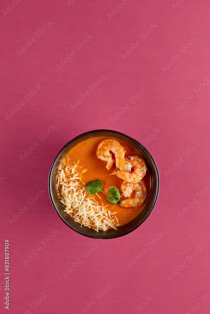Tomato Shrimp Soup with Parmesan Cheese and Herbs – Top View on Pink Background