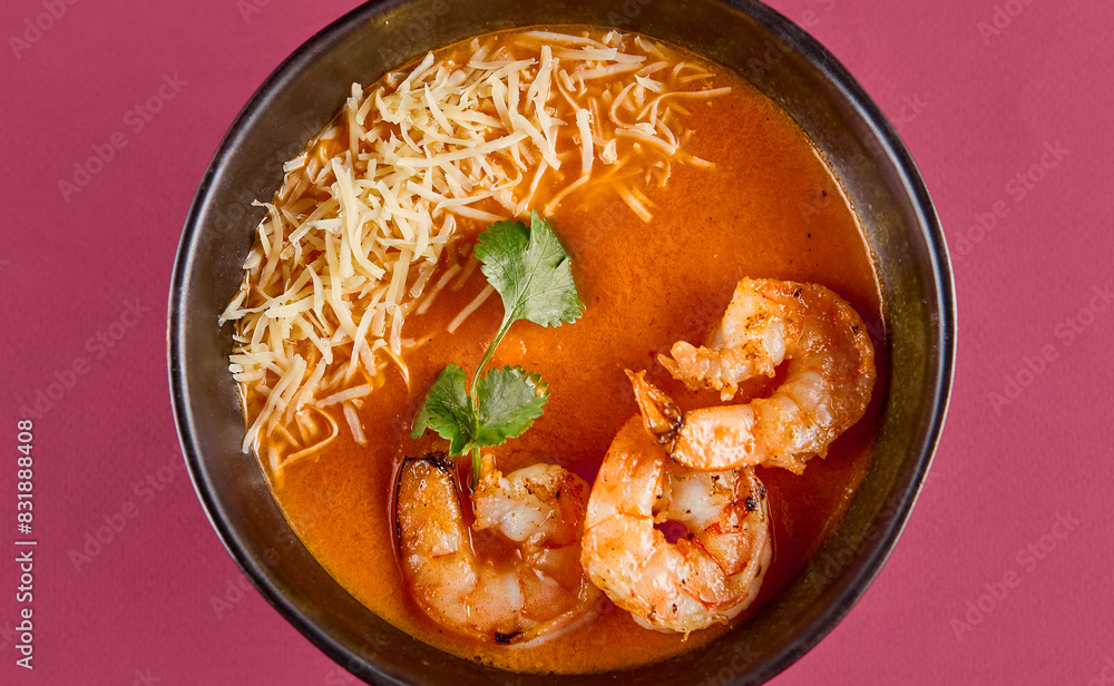 Gourmet Tomato Soup with Shrimp and Parmesan Cheese on Pink Background