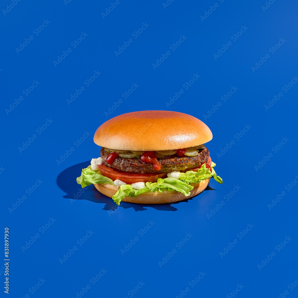 Square minimalist burger with alternative meat patty, lettuce, tomato, ketchup, pickles, and white sauce on blue. Modern food photography and takeout concept
