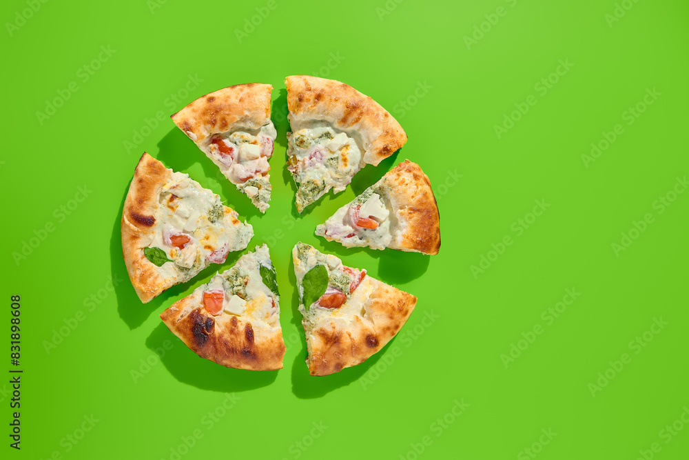 Sliced four cheese pizza with tomatoes and spinach on a bright green background, top view. Minimalist style, perfect for modern food photography, takeout, or casual meal. Fresh spinach leaves