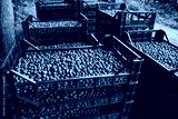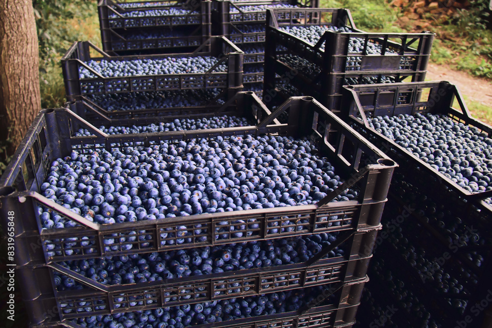 Freshly picked organic blueberries in fruit crates prepared for selling on a market.