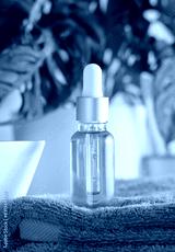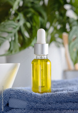 Dropper bottle filled with yellow oil on blue towel near green plant in bathroom, mockup