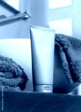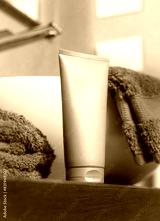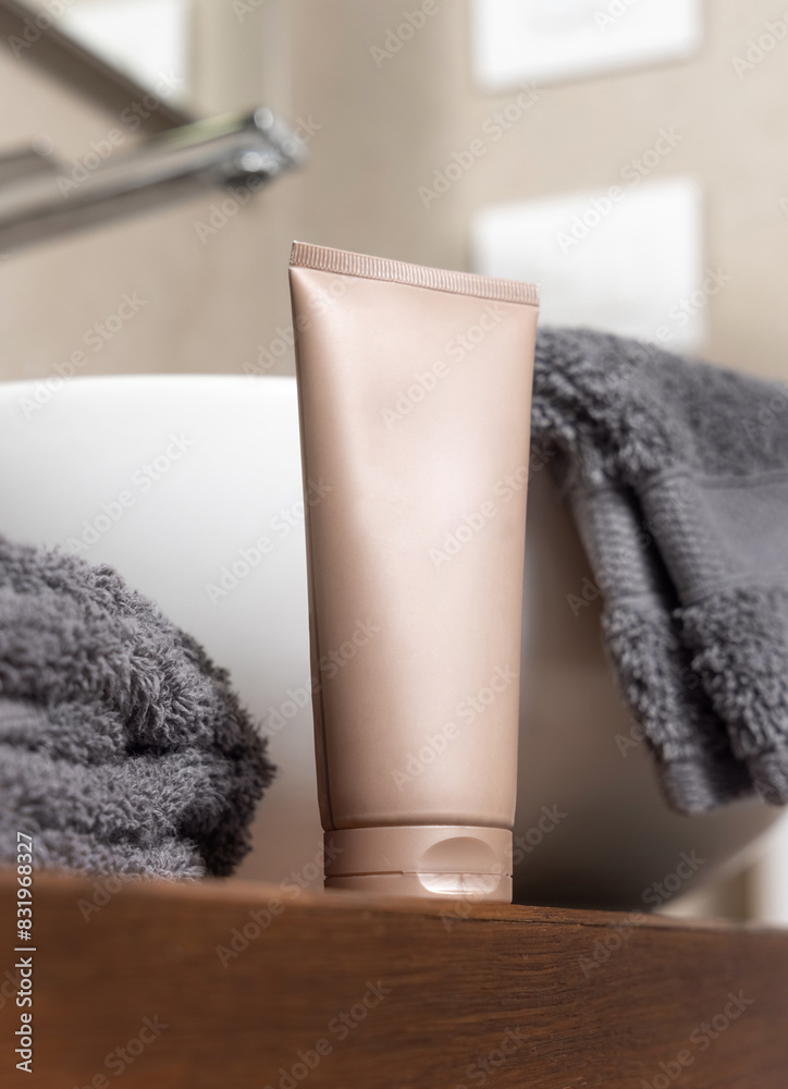 Beige cosmetic tube near grey folded towels on basin on wooden countertop in bath, mockup
