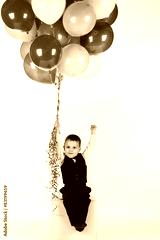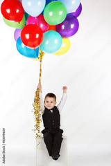 Little boy holding colorful balloons