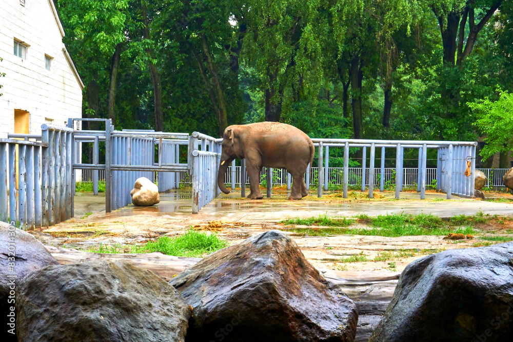 Young elephant in a summer pen,corral at the zoo