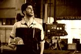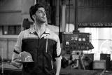 portrait factory worker or engineer holding hardhat and standing with lathe machine before start working in the factory
