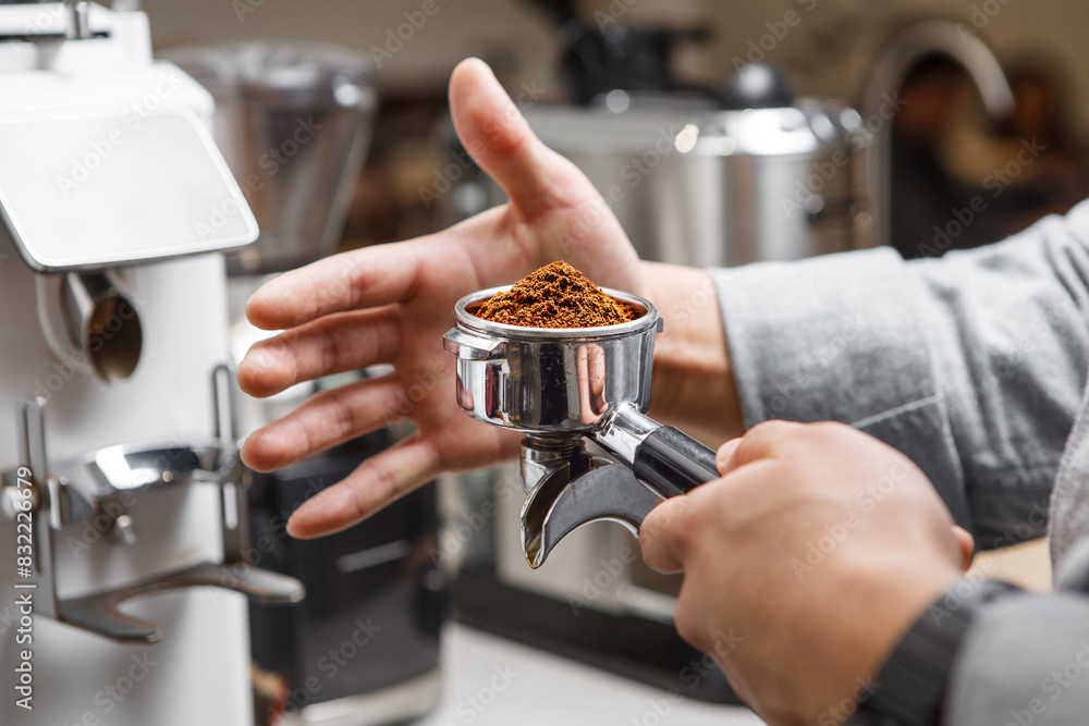Barista Perfecting Ground Coffee in Portafilter at Espresso Station