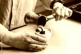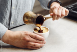 Pouring Turkish Coffee Into White Cup From Traditional Copper Cezve