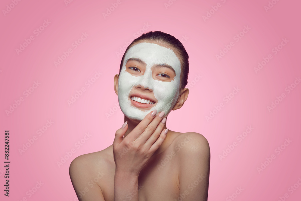 Smiling asian woman with Face Mask close up, healthy beautiful female applying green clay mask on face standing on pink isolated.