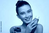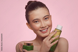 Beautiful young Asian model holds skin care products in her hands over pink isolated