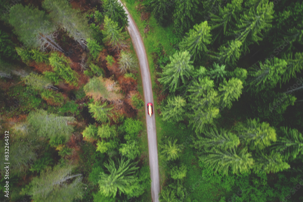 Tracking shot of car with canoe on the rooftop moving through the forest