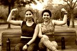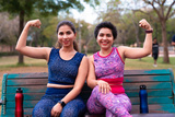 Two Young indian girls showing biceps while sit in a public park. bodybuilding, athlete, fun, friends, strength, sporty, fitness, healthy lifestyle concept.