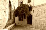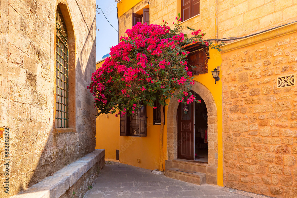Narrow medieval street with arch and flowers, Rhodes Old Town, Rhodes, Greece