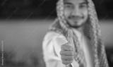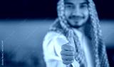 A Saudi Arabian man in traditional dress giving a thumbs up.