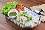 A plate of Vietnamese pork sausage with lettuce, tomatoes, and mint leaves.