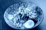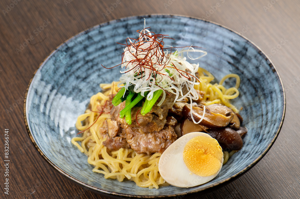 A bowl of noodles with beef, mushrooms, and a soft-boiled egg.