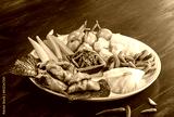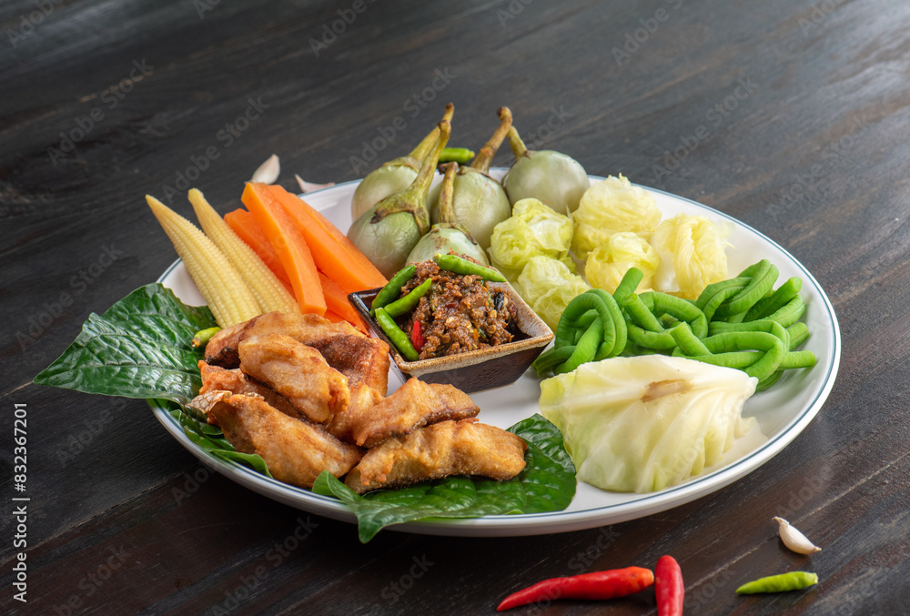 A plate of deep-fried fish and vegetables with a bowl of dipping sauce in the center.