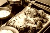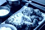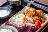A plate of Japanese fried chicken with rice, salad, and miso soup.