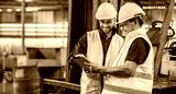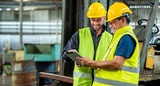 Two professional engineer worker technician assistant in helmet inspection check old machine construction factory with colleague manager. check old machinery production construction operating
