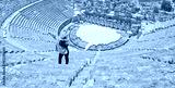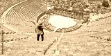 Happy woman in hat open arms in free happiness standing and posing - Roman amphitheater in ancient city of Ephesus - Selcuk, Turkey
