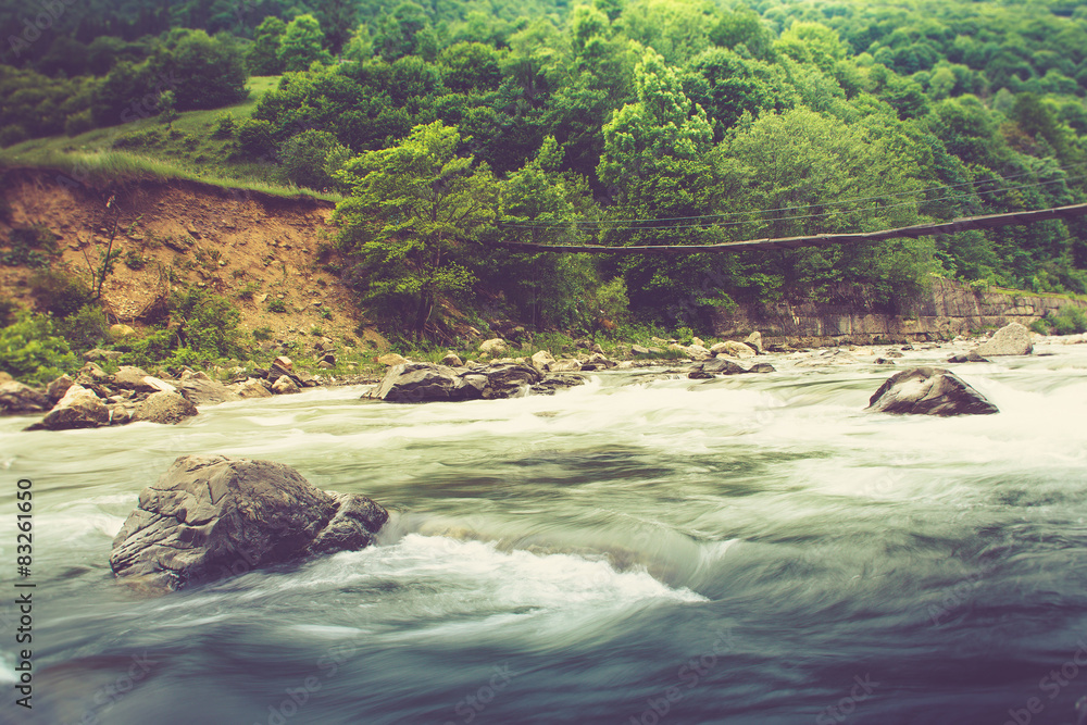 Landscape with mountain river flowing over rocks at summer.