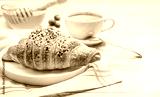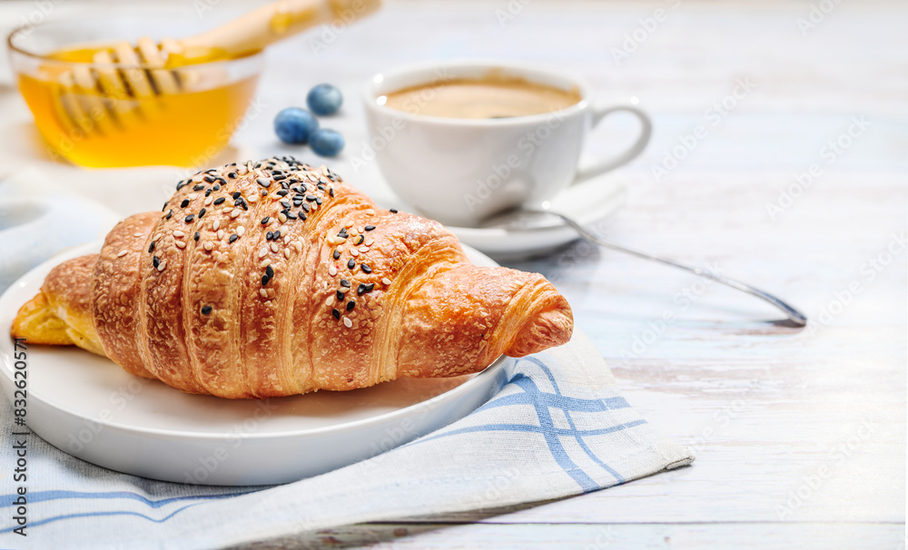 Enjoy a delicious Breakfast Croissant accompanied by Coffee and Honey laid out on a White Table